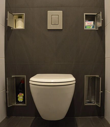 Geschikt voor in een inbouwsysteem. Ideaal voor mensen die nu een wandcloset aanschaffen. De Roll-Up kan worden ingebouwd in holle ruimtes en wanden. Bijvoorbeeld naast het inbouwframe van een wandcloset.