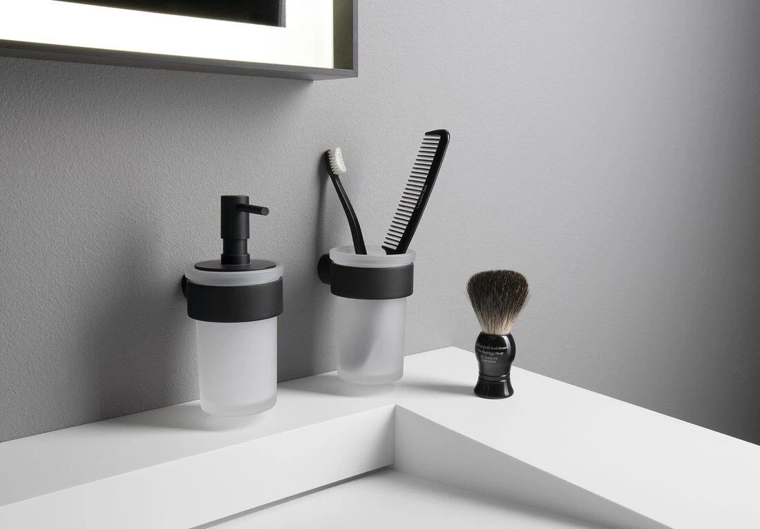 Deze hangende bekerhouder uit de Gedy Pirenei collectie heeft een modern design. De zwarte details zijn gecombineerd met satijnglas. Door deze matte afwerking is het glas ondoorzichtig. Dit geeft de bekerhouder niet alleen een luxe look, maar maakt het geheel ook netter om te zien. Om het geheel helemaal af te maken combineer je de bekerhouder met de andere accessoires uit de Gedy Pirenei collectie.