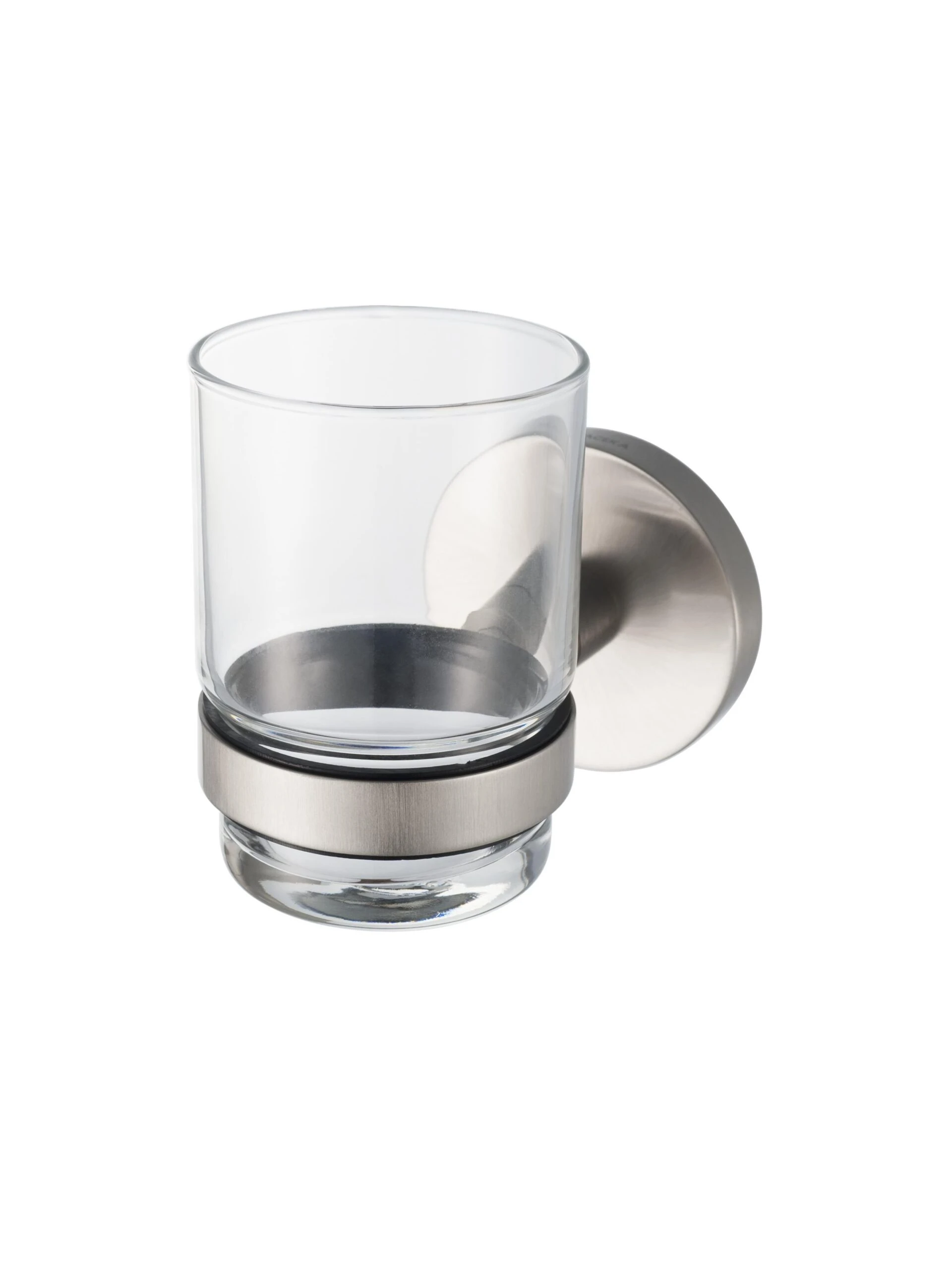 Strakke, solide bekerhouder met een beker gemaakt van helder glas. Door de zwarte rubberen ring wordt de beker stevig vastgeklemd. De houder monteert u snel en eenvoudig aan de wand.