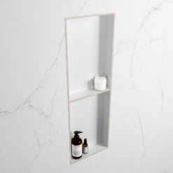 De nis heeft aan de buitenrand de kleur linen (beige) en aan de binnenkant de kleur talc (wit). Deze combinatie van zachte kleuren geeft de nis een warme uitstraling.