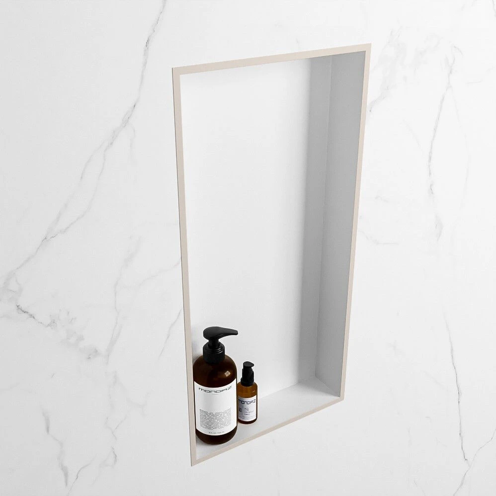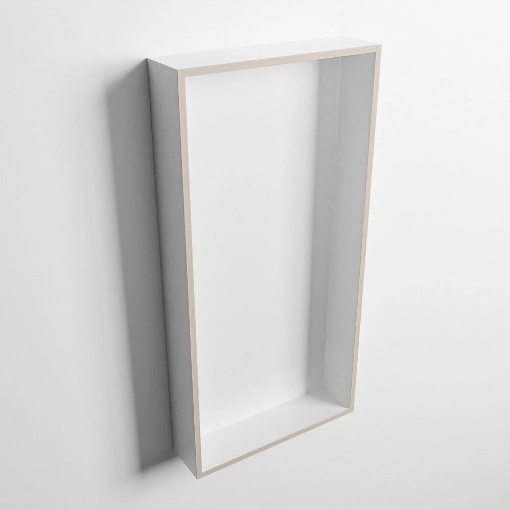 De nis heeft aan de buitenrand de kleur linen (beige) en aan de binnenkant de kleur talc (wit). Deze combinatie van zachte kleuren geeft de nis een warme uitstraling.