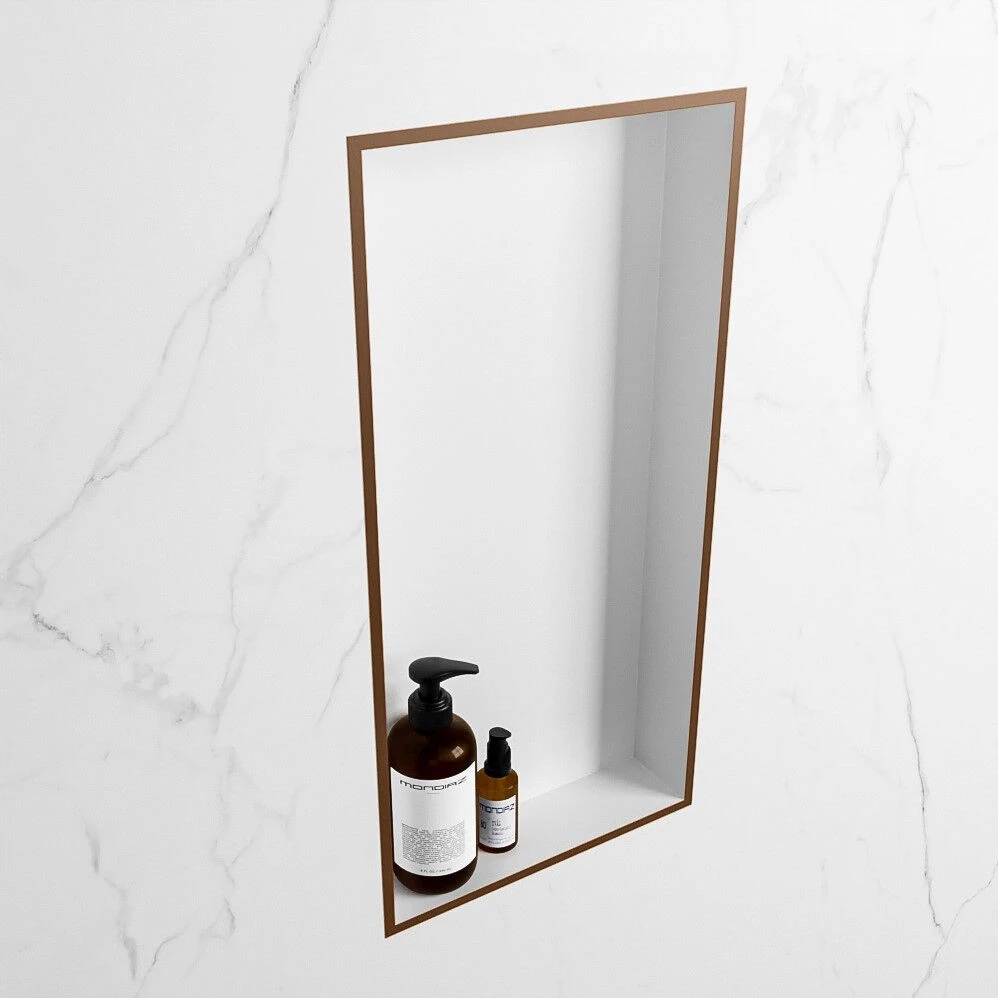 De nis heeft aan de buitenrand de kleur rust (bruin) en aan de binnenkant de kleur talc (wit). Deze donkerbruine kleur geeft een warme uitstraling aan je badkamer.