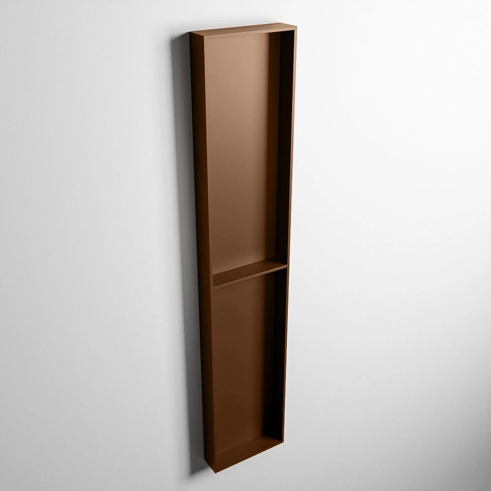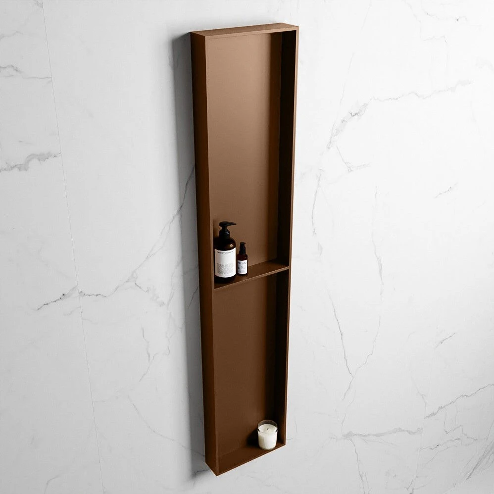 De nis komt in de kleur rust (bruin). Deze donkerbruine kleur geeft een warme uitstraling aan je badkamer.