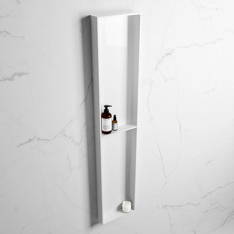 Deze nis komt in de kleur talc. Door deze witte kleur past de nis goed in vele badkamerstijlen. Een ander voordeel van de originele witte kleur van het solid surface materiaal is dat het opgeschuurd kan worden. Zo zijn eventuele beschadigingen gemakkelijk te verwijderen.