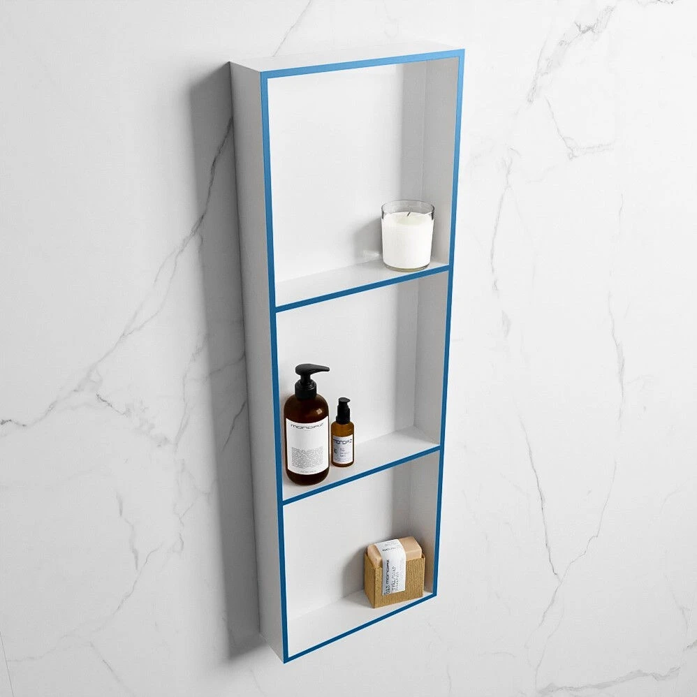 De nis heeft aan de buitenrand de kleur jeans (blauw) en aan de binnenkant de kleur talc (wit). De blauwe kleur geeft het de nis een tropische en frisse look. Perfect voor in de badkamer dus!