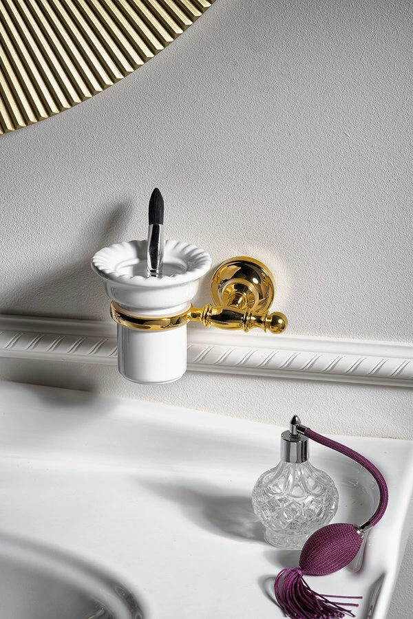 De bekerhouder uit de Sapho Perla collectie heeft een elegant design door de ronde vormen en de details in de keramieken beker. De houder is gemaakt van messing en komt in de kleur goud. Gebruik de beker om bijvoorbeeld je tandenborstels in op te bergen. Om het geheel helemaal af te maken combineer je de bekerhouder met de andere accessoires uit de Perla collectie.