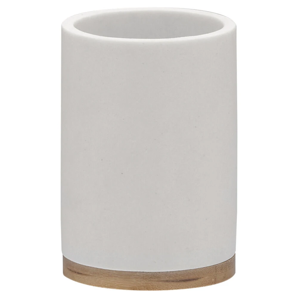 De badkameraccessoires zijn vervaardigd van polyresine, een supersterke kunsthars, gecombineerd met bamboo. Beschikbaar in wit en zandkleur.