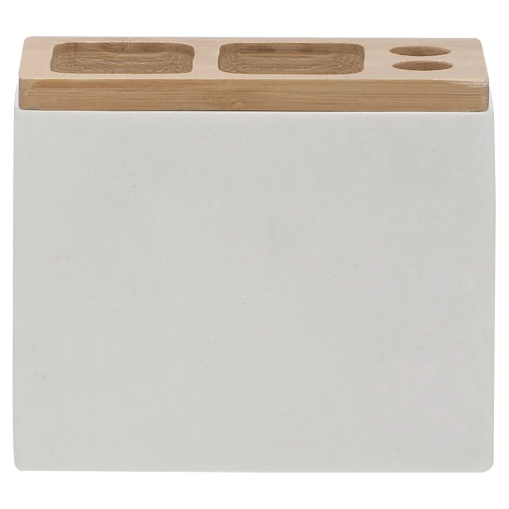 De badkameraccessoires zijn vervaardigd van polyresine, een supersterke kunsthars, gecombineerd met bamboo. Beschikbaar in wit en zandkleur.