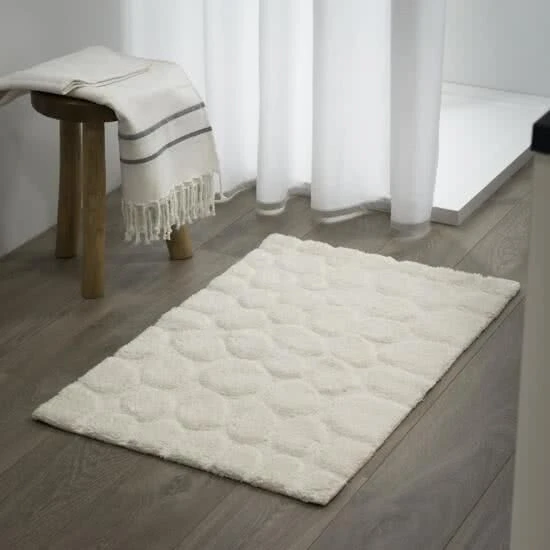De badmat en toiletmat Pebbles hebben een leuke vormgeving die lijkt op een ondergrond van stenen. Maar dan natuurlijk in een heerlijk zachte uitvoering van 100% katoen. De badmat en toiletmat zijn beschikbaar in warm grijs en ivoor en geven de badkamer een mooie natuurlijke look.