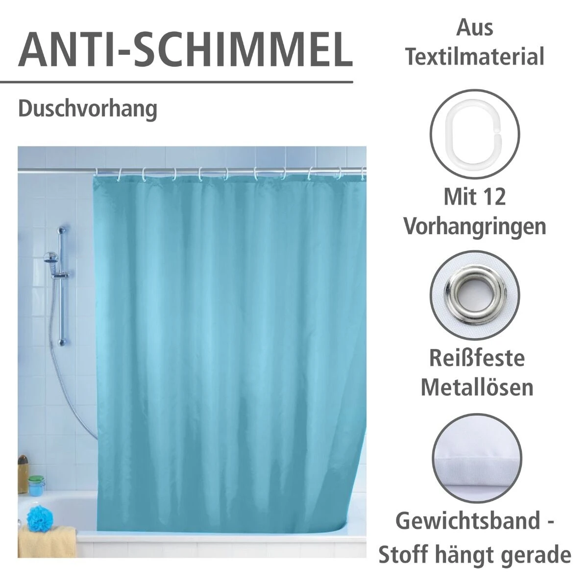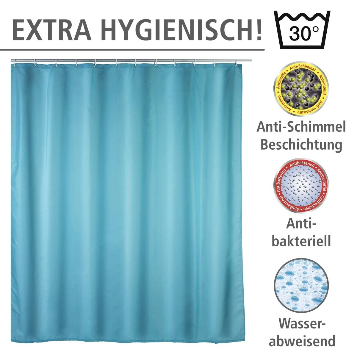 Fijn aan het douchegordijn is dat je hem meteen kan ophangen! Hij wordt namelijk geleverd met 12 witte kunststof ophangringen. Liever een ander kleurtje? Dat kan! Check snel de varianten om de andere kleuren te shoppen.