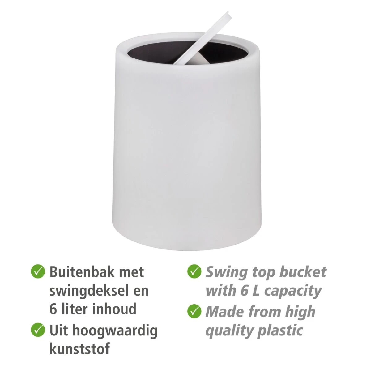 Deze witte prullenbak van Wenko heeft een handige functie die zorgt voor een prullenbakje die je niet wil missen! De prullenbak heeft namelijk een binnenbak waar je de buitenbak met swingdeksel overheen plaatst. Handig met het verwisselen van de vuilniszak. Het strakke design zorgt voor een onopvallend prullenbakje, mooi in je minimalistische badkamer!