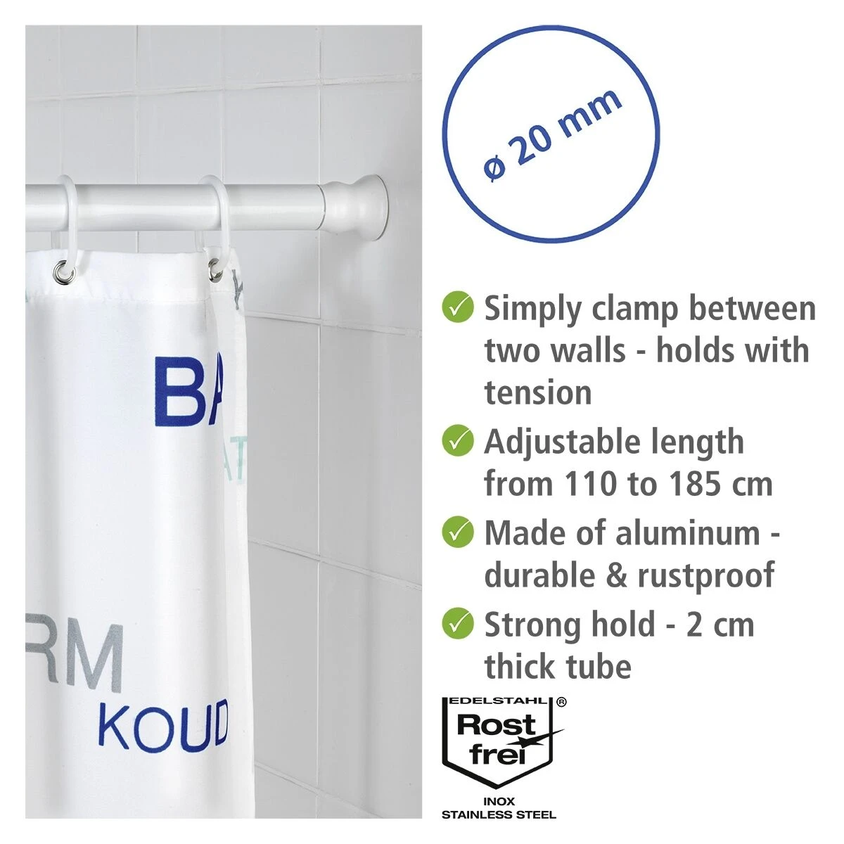 De lengte van de douchegordijnstang is traploos instelbaar van 110 tot 185cm.